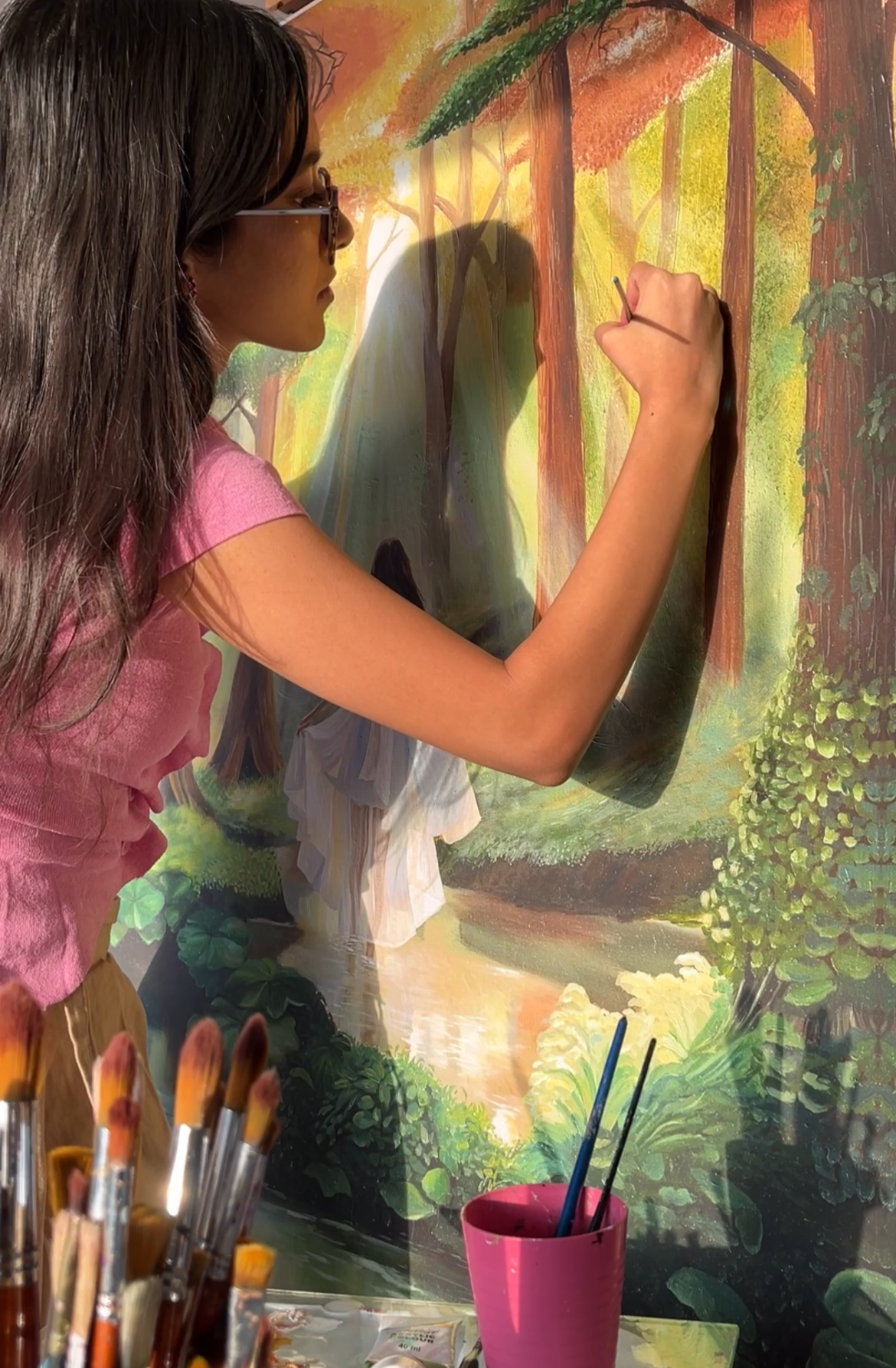Each print is produced on heavyweight 400 gsm cotton canvas using UltraChrome archival pigment inks, ensuring exceptional richness, depth, and longevity. Nandini hand embellishes every piece with delicate, intentional brushwork, enhancing the sunlight, forest textures, and the gold-highlighted scar on the figure’s back. These subtle additions make each print uniquely expressive, bridging the gap between a reproduction and an original.