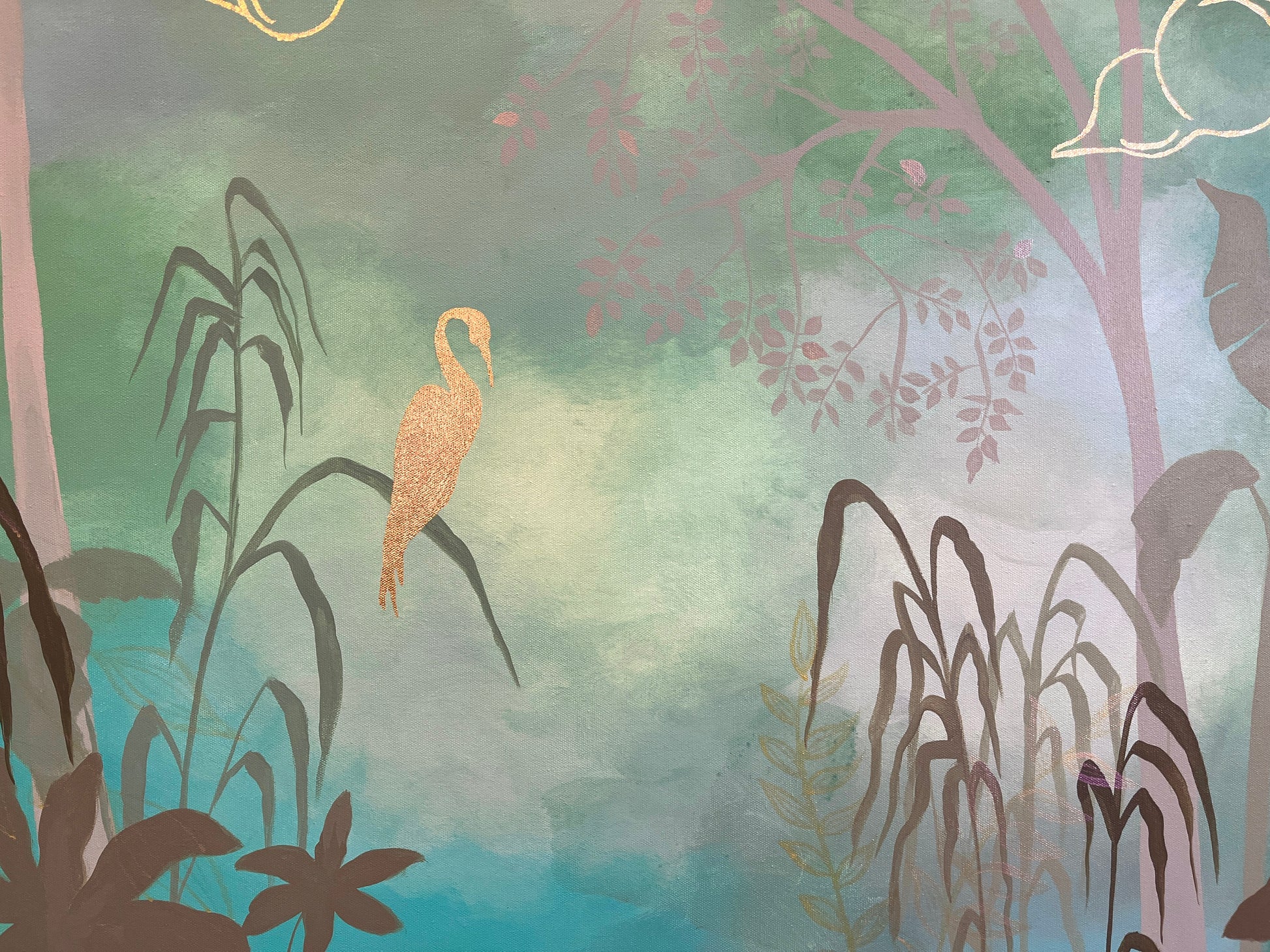 Immerse yourself in the quiet mystery of a forest dreamscape with Whispers of the Canopy. This original artwork is a serene meditation on nature, where layered greens and soft gradients evoke the depth and calm of a hidden grove. The scene is gently illuminated by delicate gold-foiled clouds, drifting through a lush overhead canopy, nature’s own ceiling, rich with life and light.